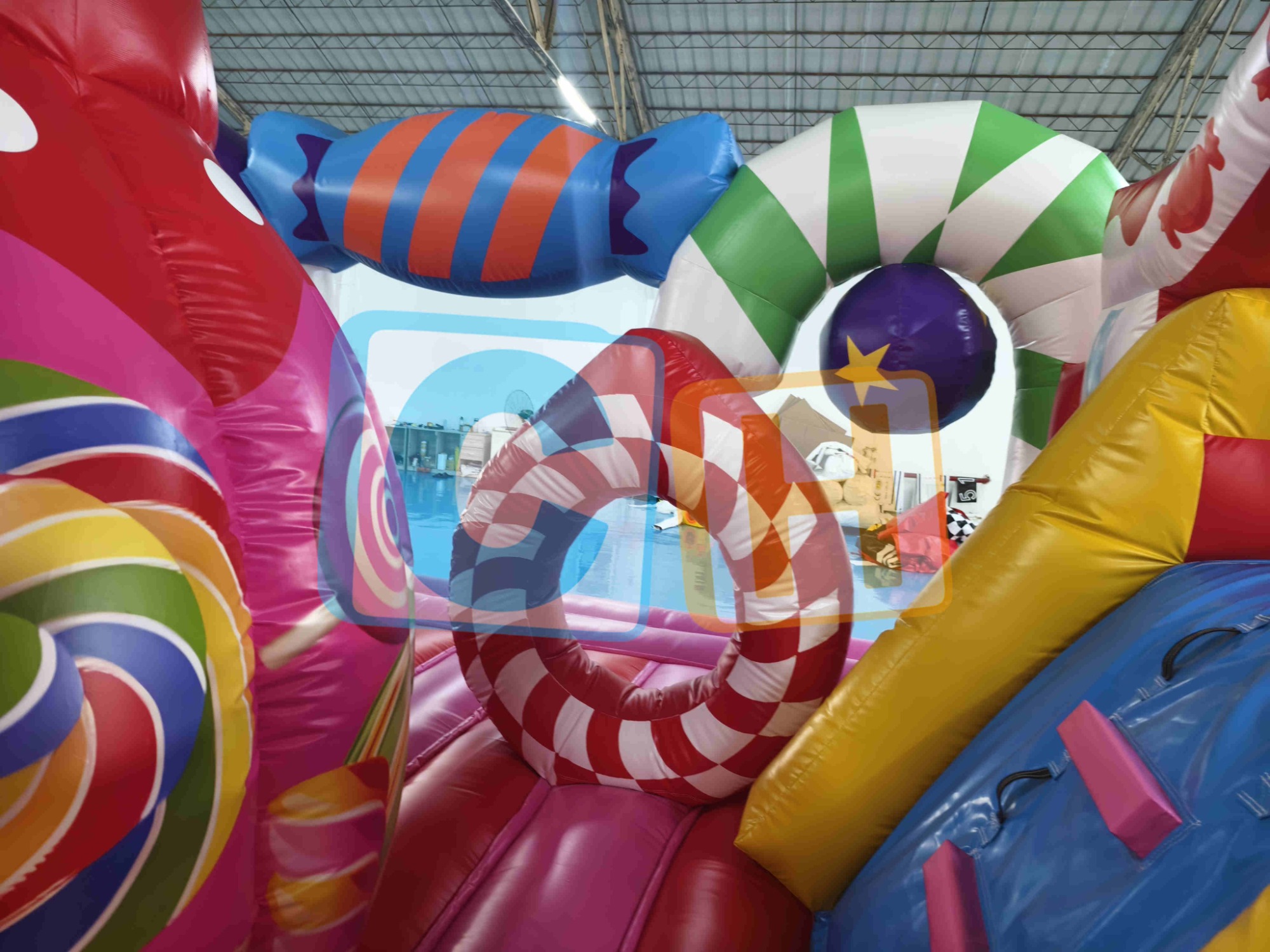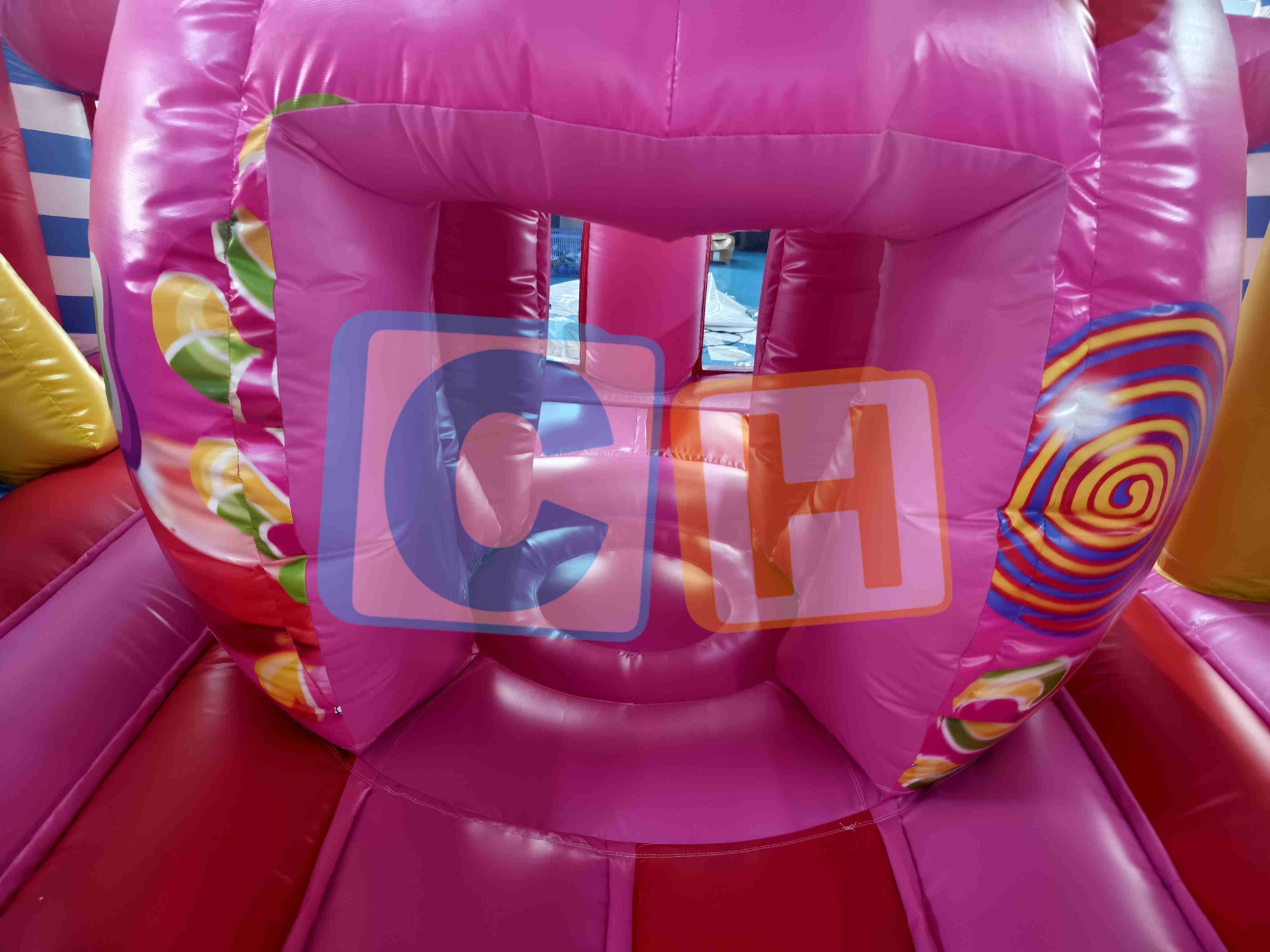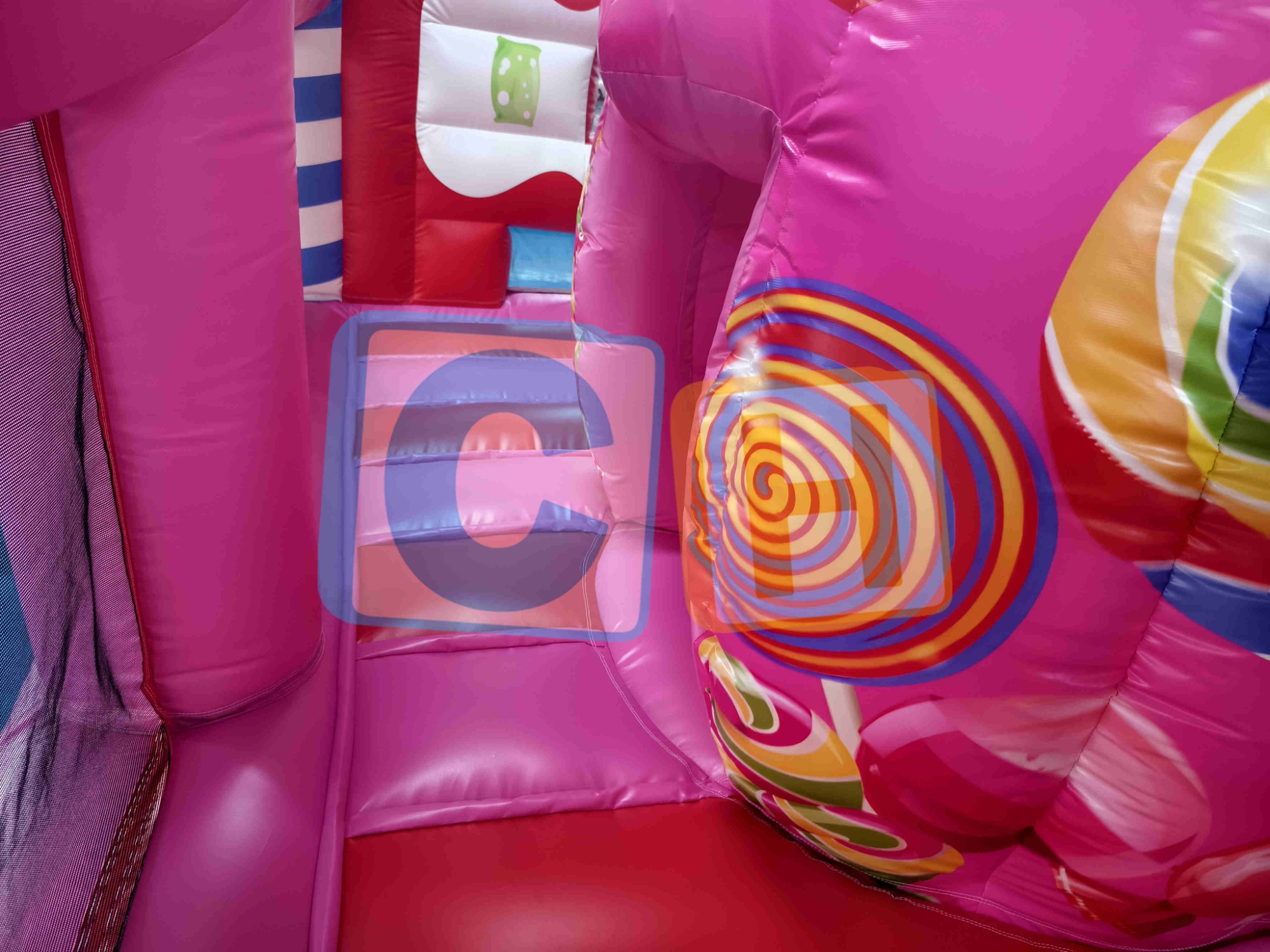 CANDY Inflatable Jump 'n Slide Bouncy – Sweetest Adventure for Sugar-Rush Fun! Built with 0.55mm 1300D PVC, double-stitched seams, and 18 reinforced anchor points for extra-sticky durability.