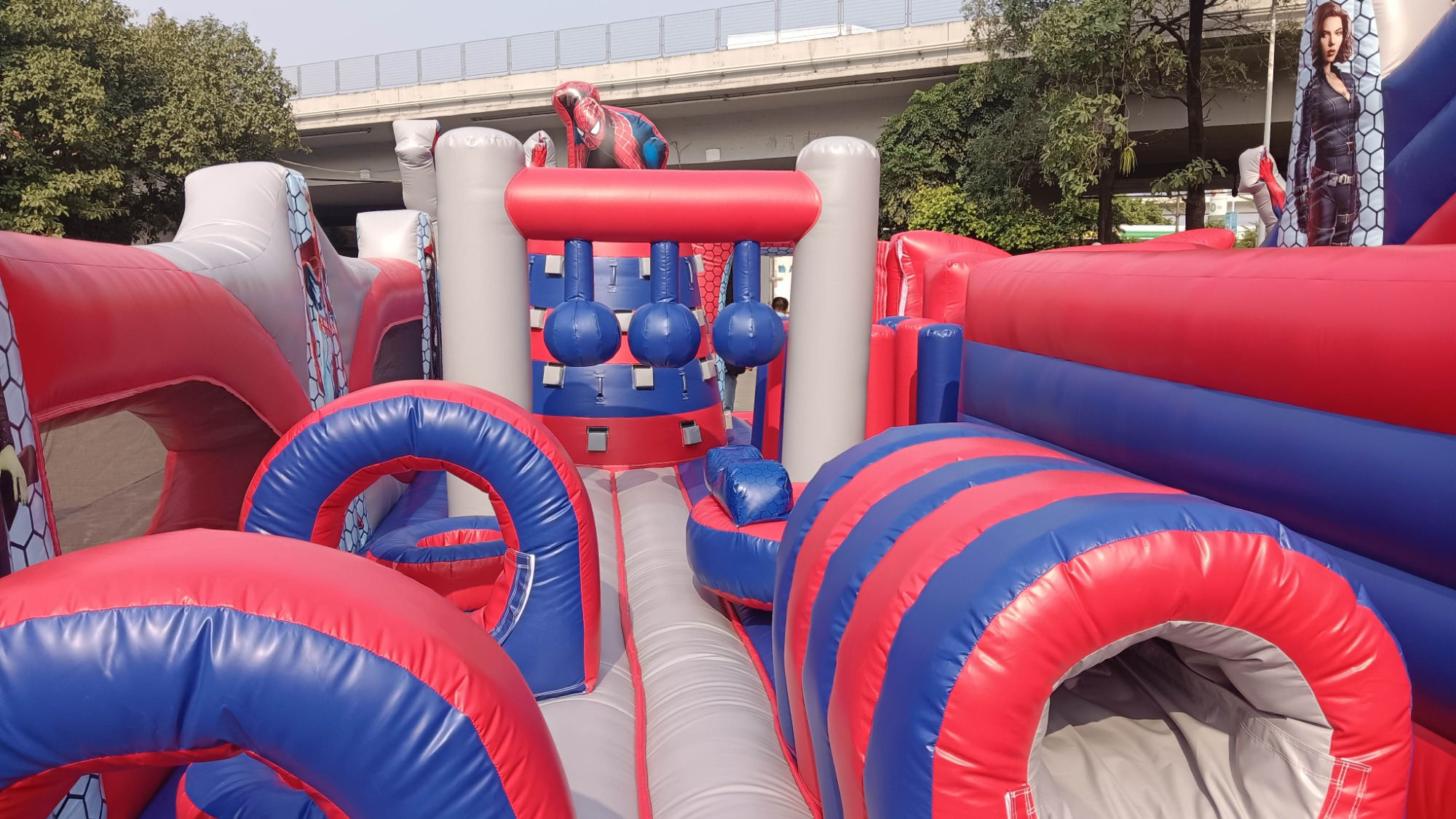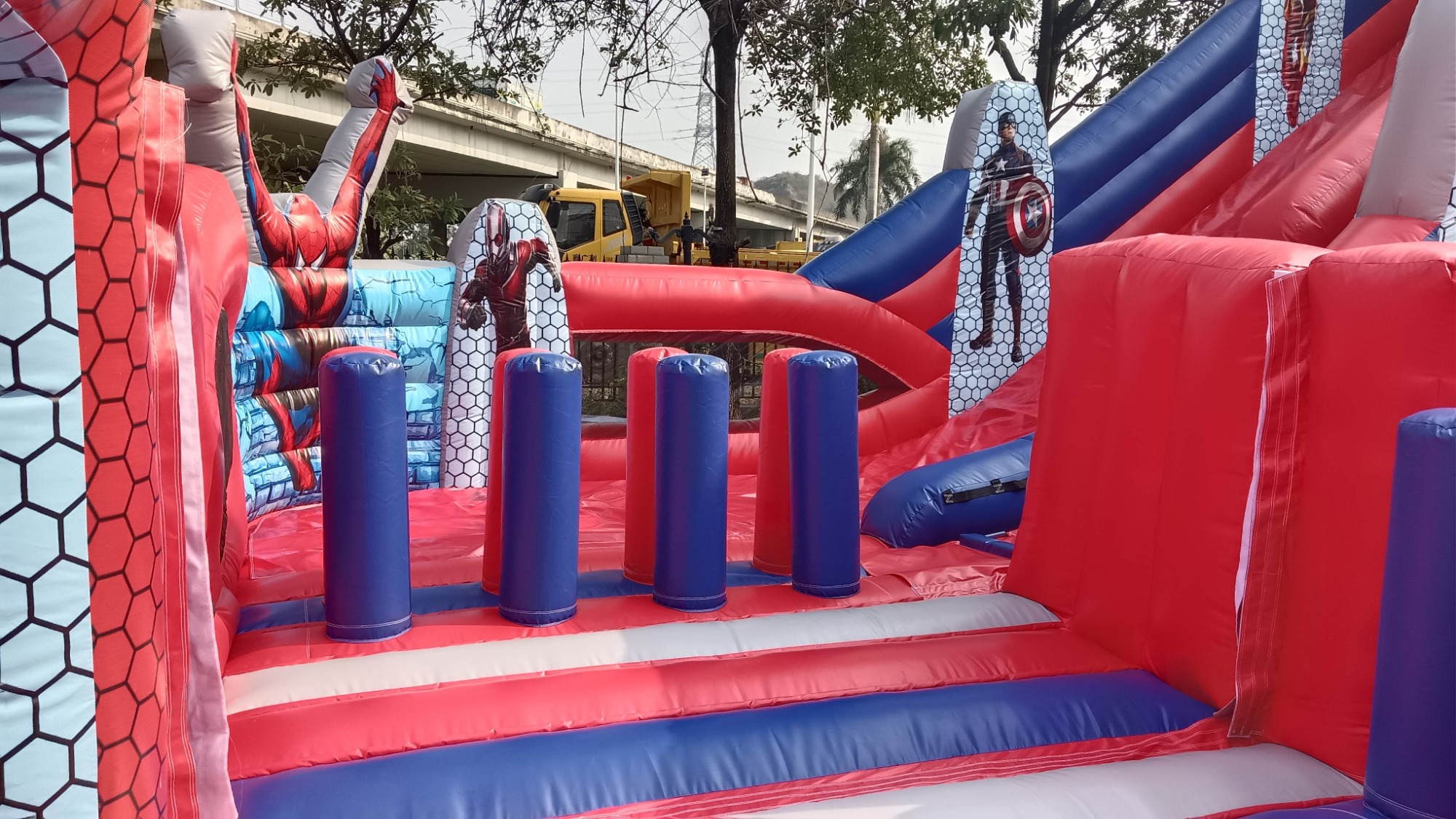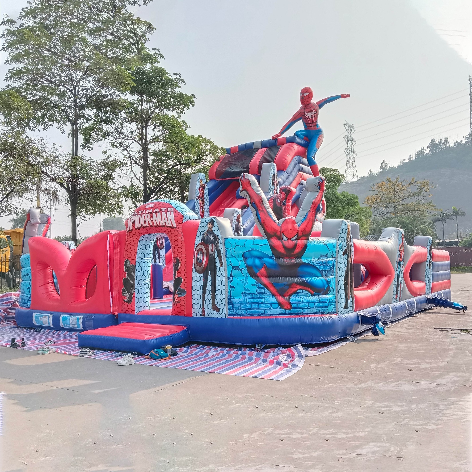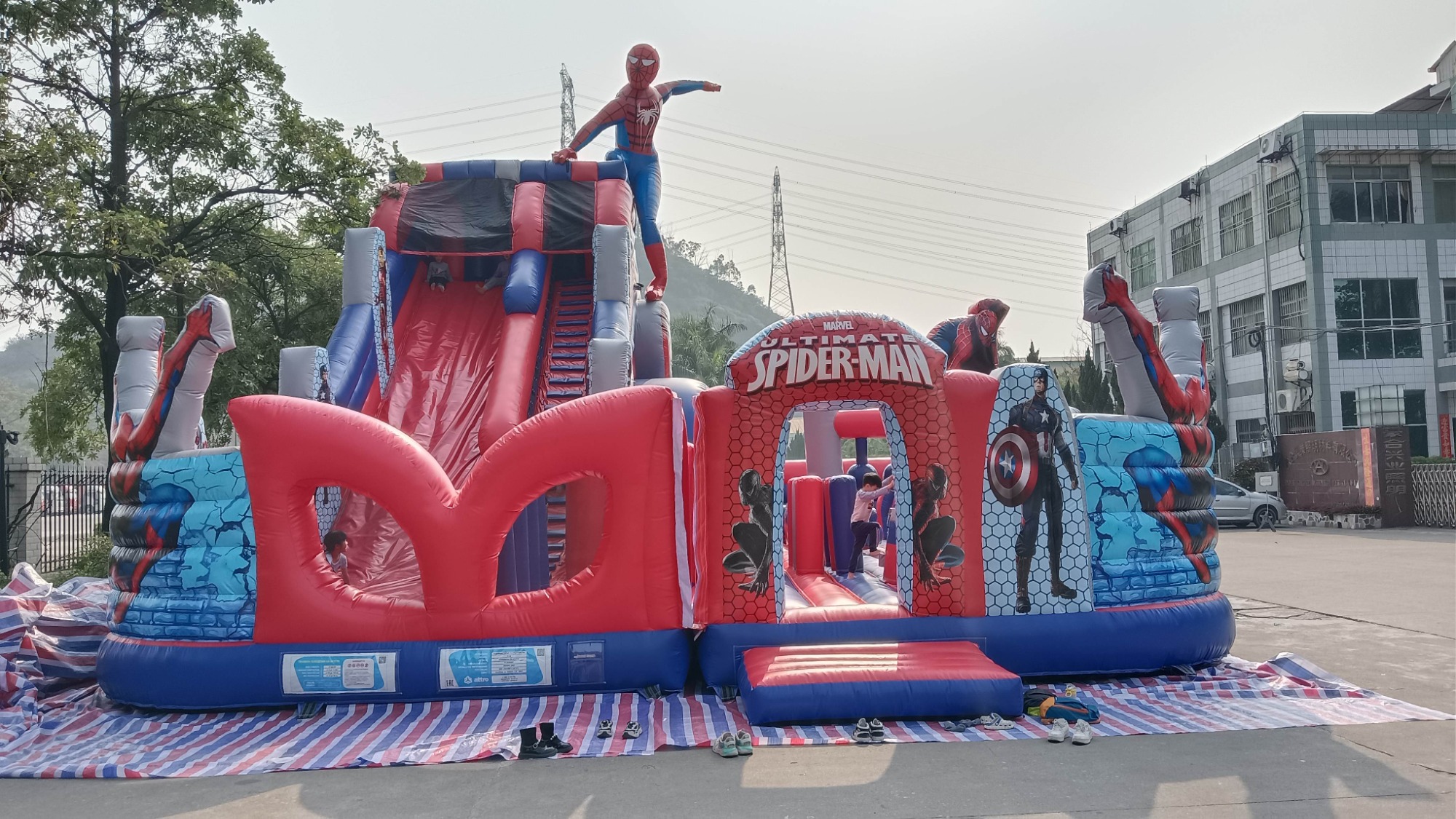Spider-Man Superhero Inflatable Park – 7m Slide + Obstacle Course + Avengers Theme! Unleash superhero energy with this action-packed Spider-Man inflatable park, featuring a 7m mega slide with a towering Spidey figure, an exciting obstacle course, and Captain America entrance graphics! Bursting with vibrant Marvel designs, this park is a dream come true for comic fans and perfect for birthday parties, carnivals, and superhero-themed events.