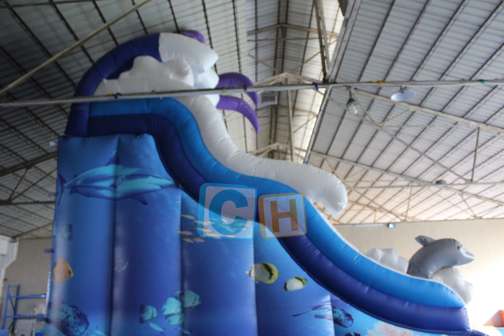 Dive into fun with this commercial inflatable water slide! Measuring L7*W5*H7.5m with a L7*W5*H0.6m pool, it features an ocean - themed design. Rich spray - painted sea patterns adorn the sides, and a separate front pool awaits for a thrilling splash - down. Ideal for commercial events!